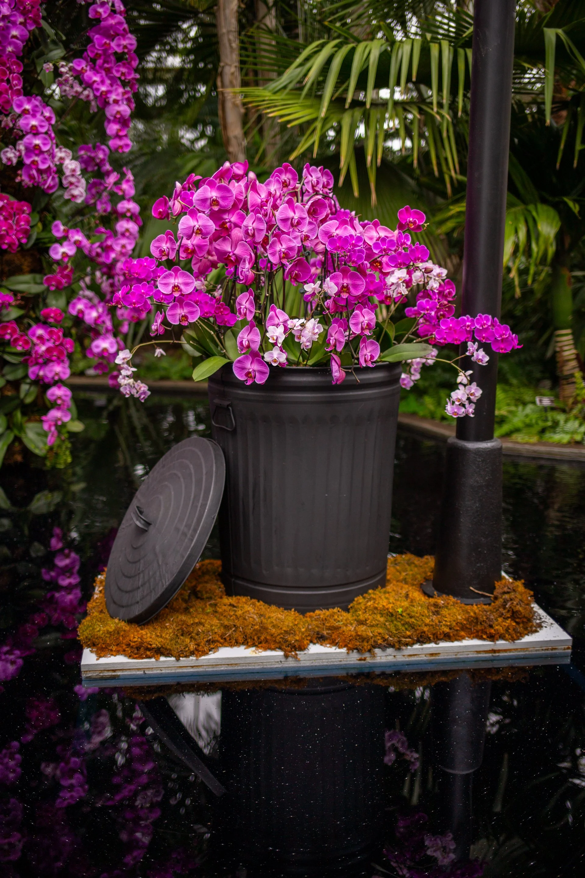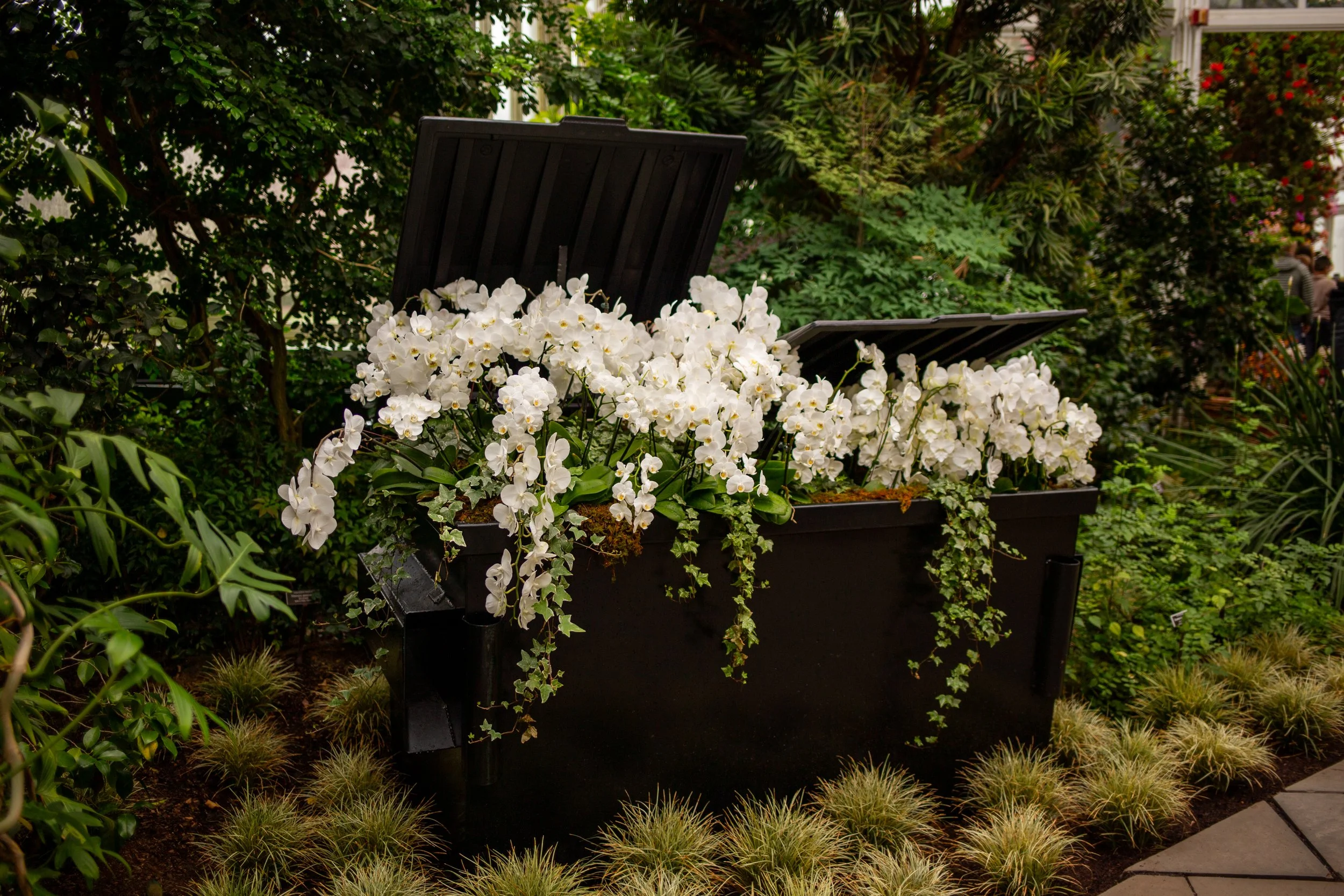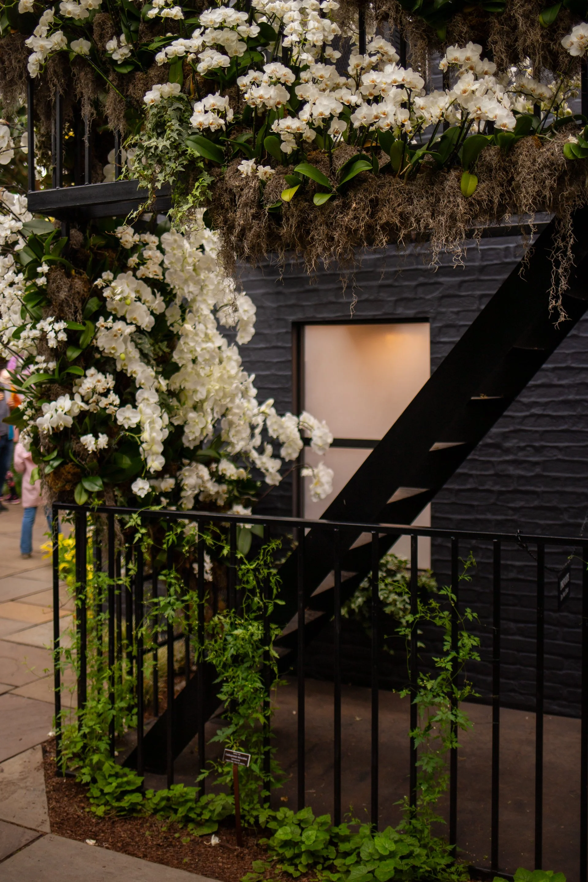 The first piece you see upon entering the always-dazzling Enid Haupt Conservatory, is a brownstone covered in orchids. Or maybe it’s the second, or tenth thing you notice; I wouldn’t be surprised if you missed this show-opener entirely. Set in the middle of a small pond, the monochromatic brownstone (which here is rendered pitch black, as are most of the other set pieces in the show) disappears almost completely behind a cascade of colorful orchids. And maybe that’s the point! I understand how contrast works. If you want to let the flowers shine, slathering everything in matte black paint is a good way to do so.