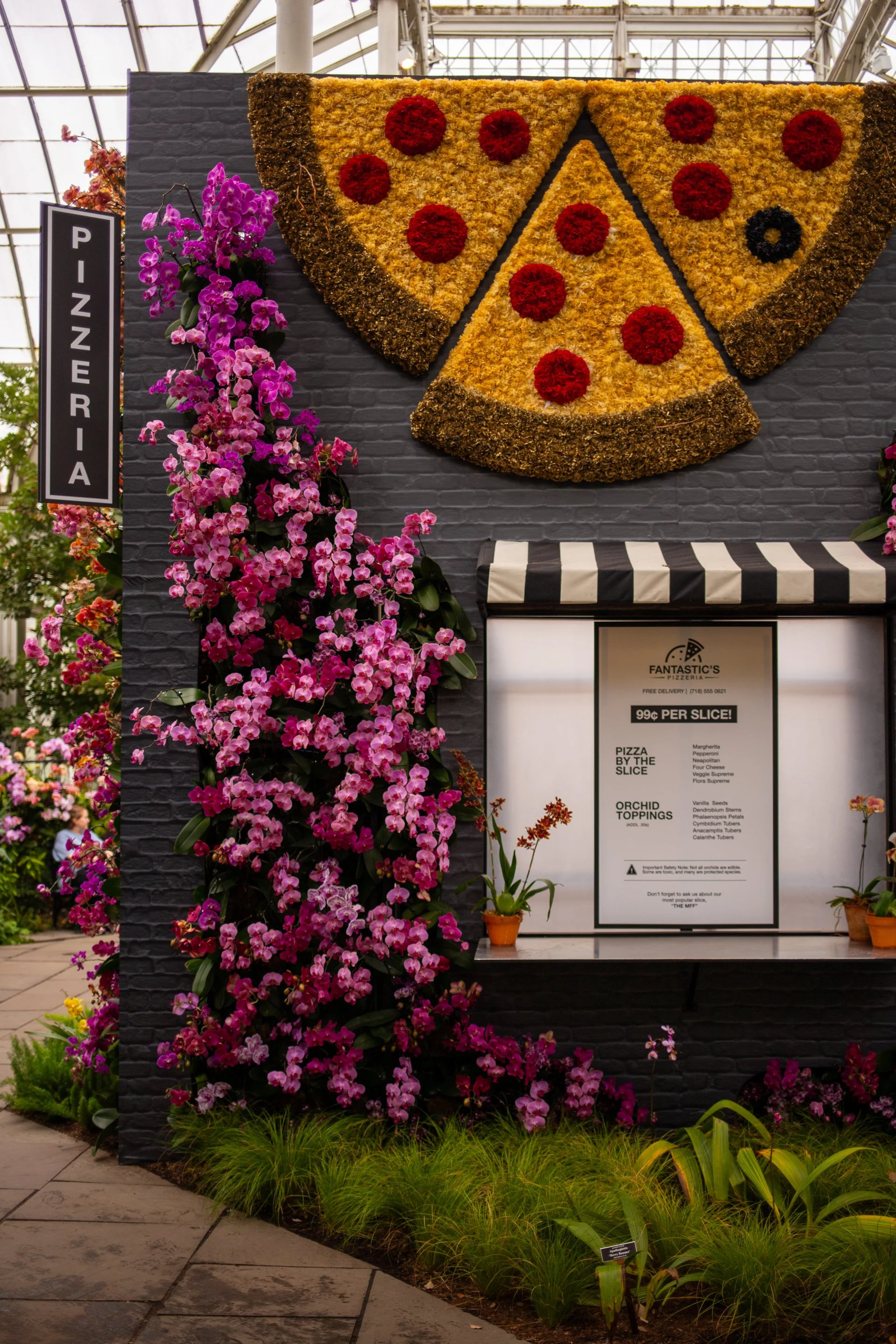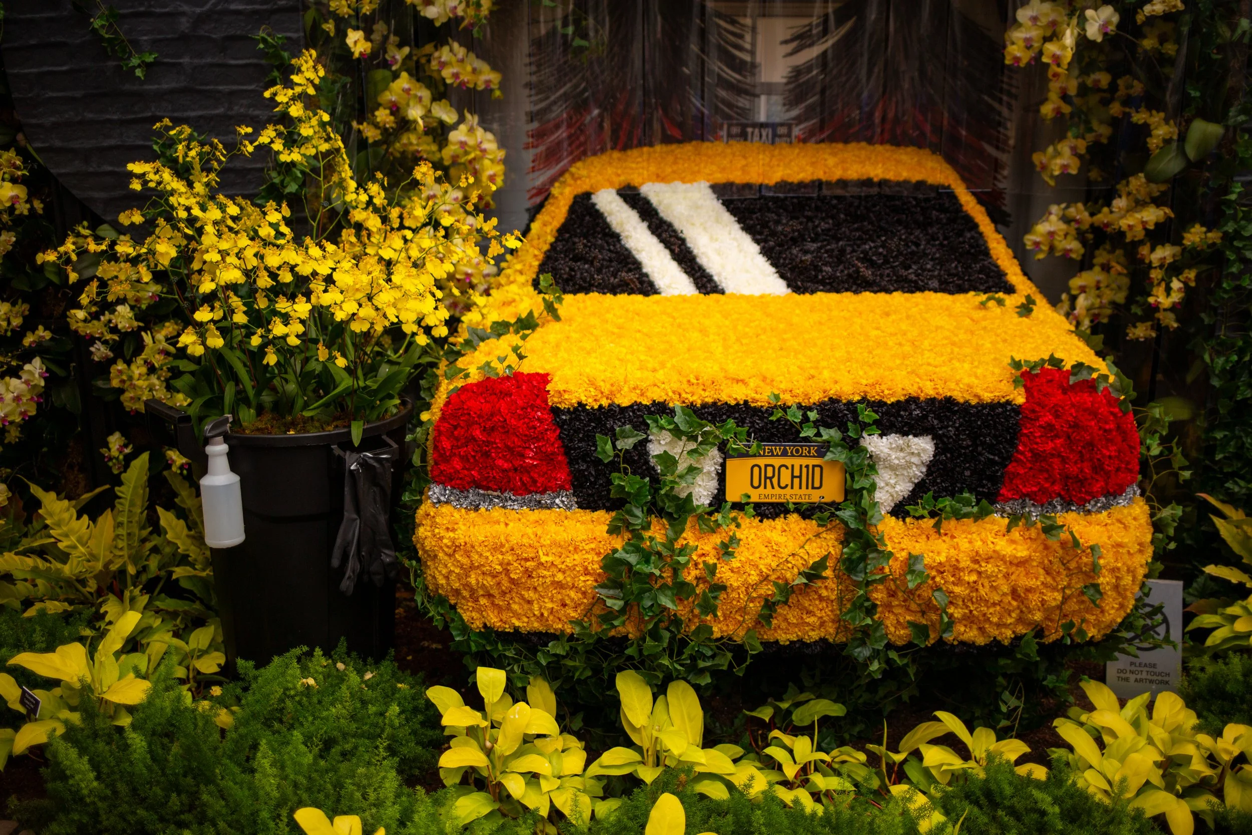 At best, the installations recede into the background and cede attention back on the orchids: My uncle went with me, said he ignored the New York theme completely, and enjoyed himself. At their most unforgivable, MFF’s creations were too complex to interplay with orchids at all—or lazily designed that way: Oversize pizza slices, an orange-and-white striped steam tube, and the back half of a lifesize cab (bearing the license plate ORCH1D) are covered in (fake!) carnations.