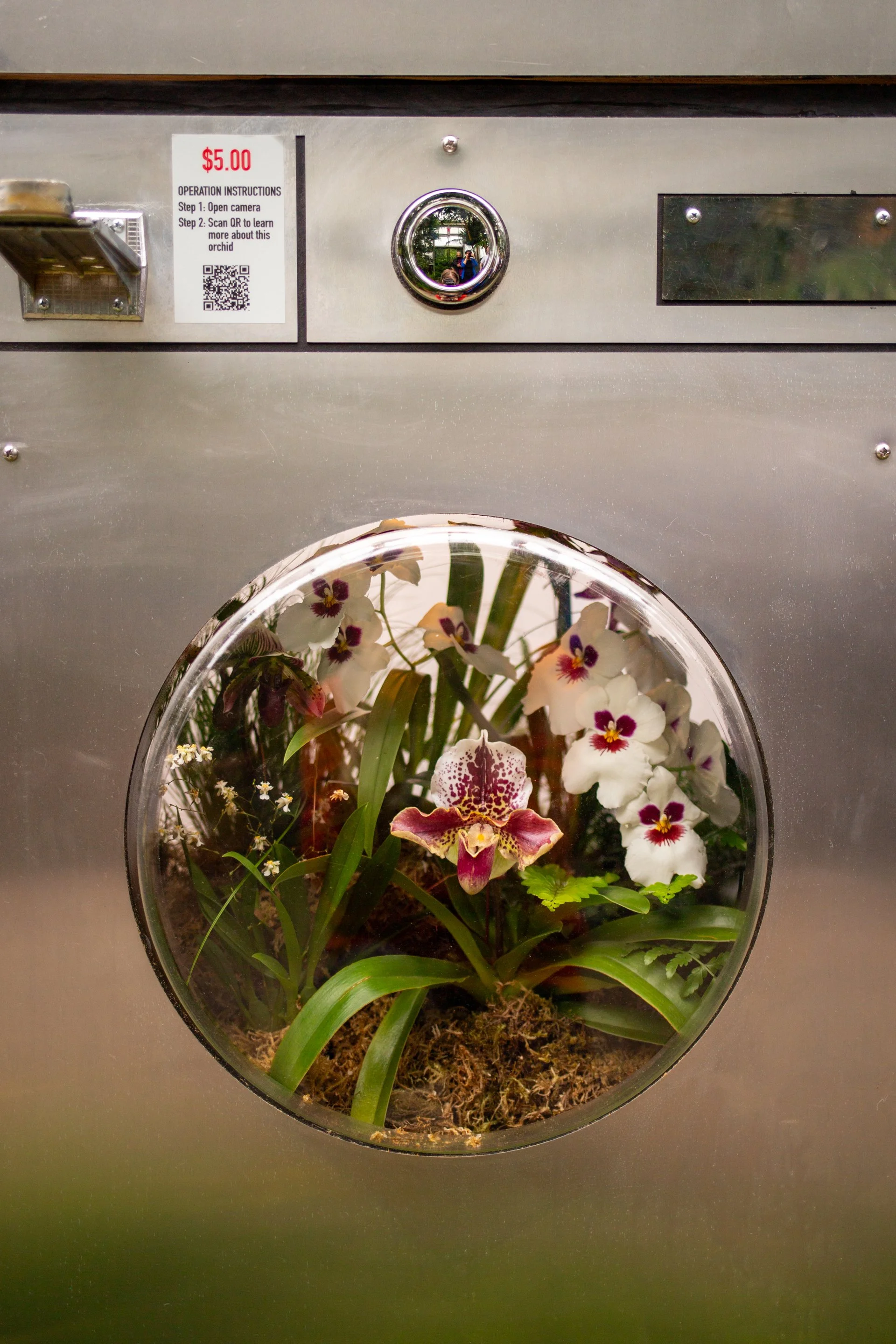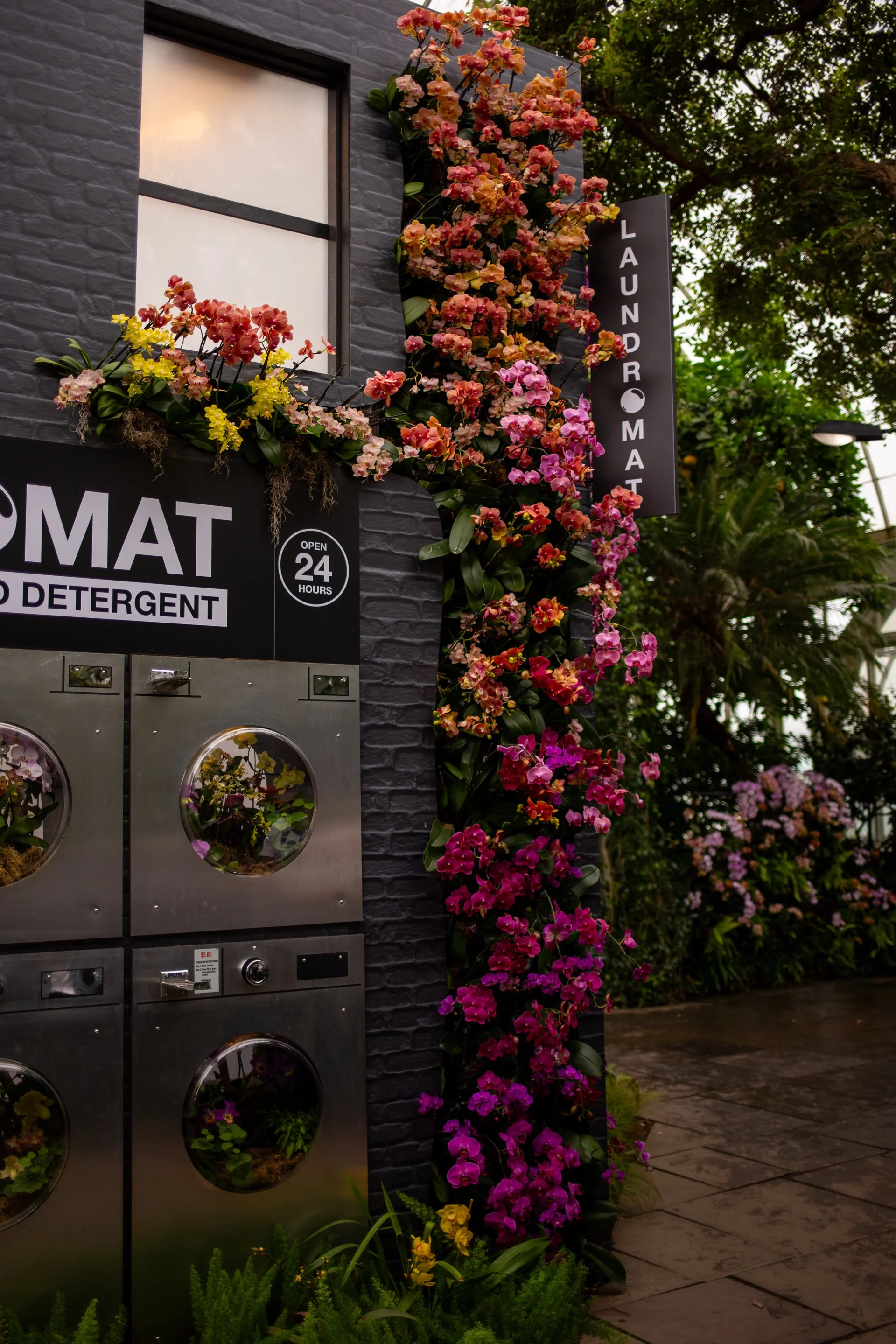 Conversely, the machines in Fantastic Laundromat “cost” $5 and direct visitors to scan a QR code to learn more about the orchids peaking out from behind round windows. This isn’t a criticism unique to the garden unfortunately, but the last thing I want to do—especially when I’m in a conservatory full of extraordinary live plants—is be tethered to my phone. (I’d take a visually dull explanatory placard over none at all).