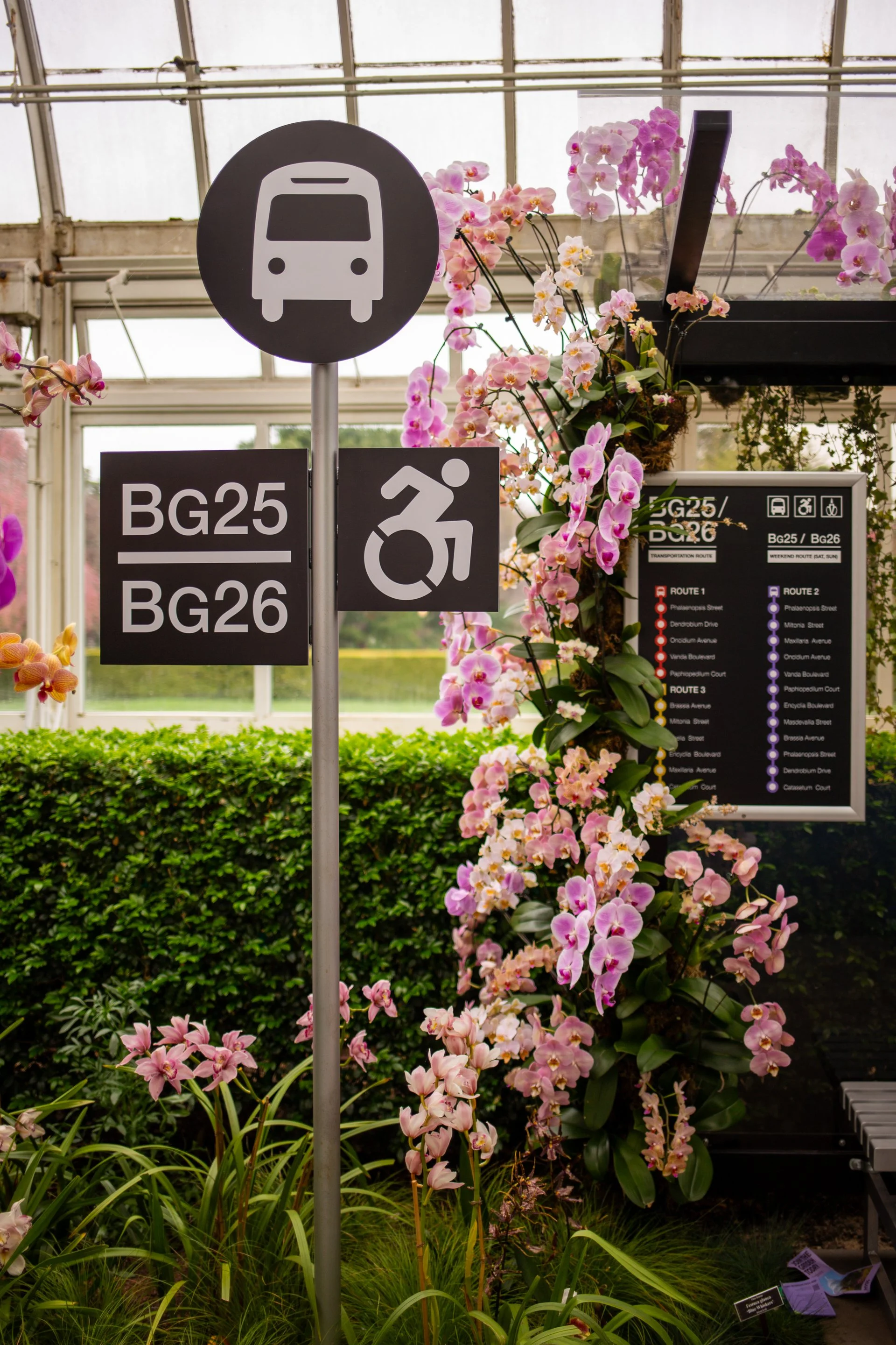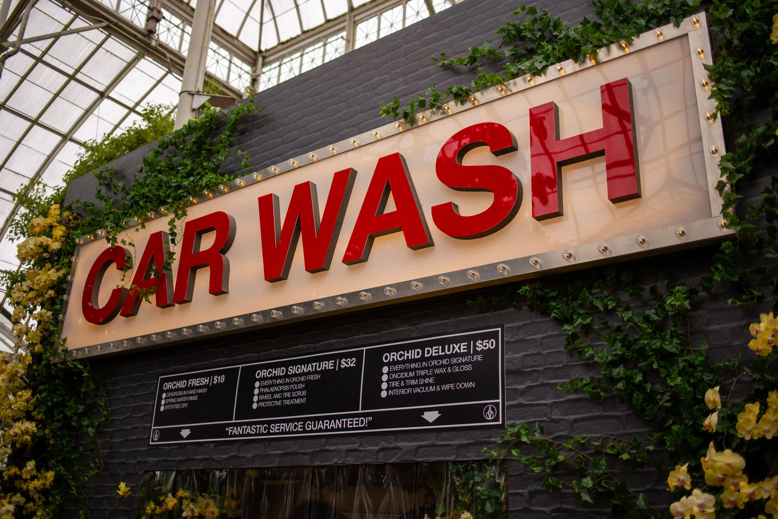 Forgive me for being literal, but I come to the orchid show to see orchids, and I came to this show specifically to see orchids set amongst “a dazzling reimagining of the Big Apple, from stoops and slice shops to the subway itself.” I suppose the “reimagining” part is technically correct, but I wish MFF had more imagination, particularly with the signage. His newsstand, slice shop, laundromat, and car wash are saddled with uninspired names and signs to match (particularly unforgivable in a city that includes generations of free graphic inspiration and a newly-opened museum dedicated to preserving it).