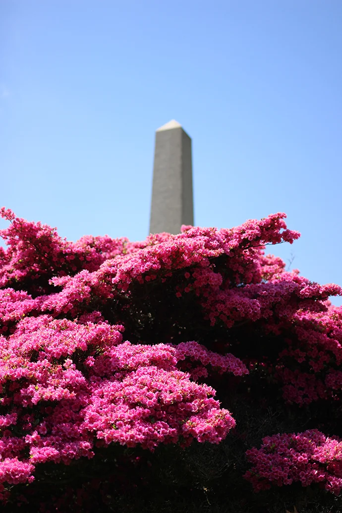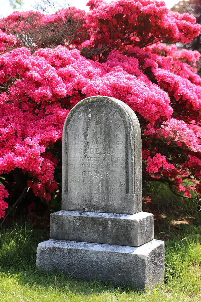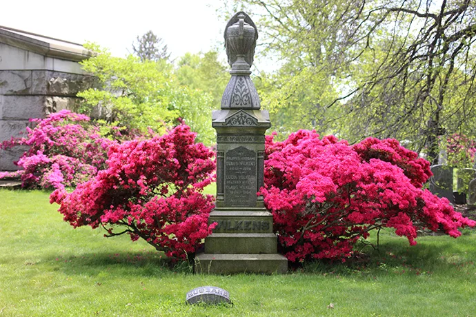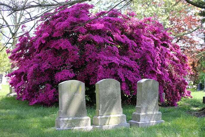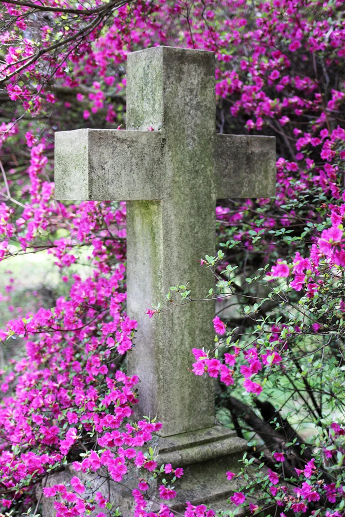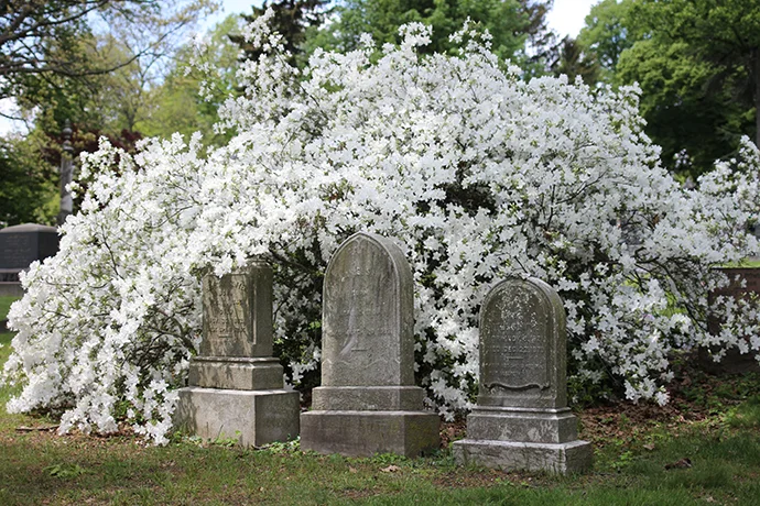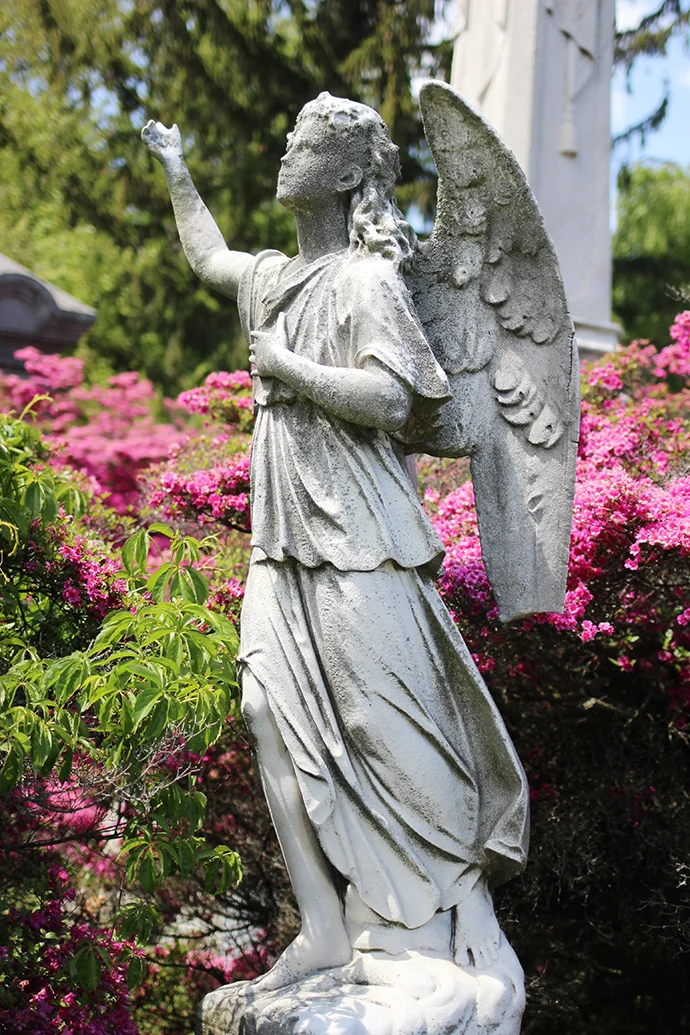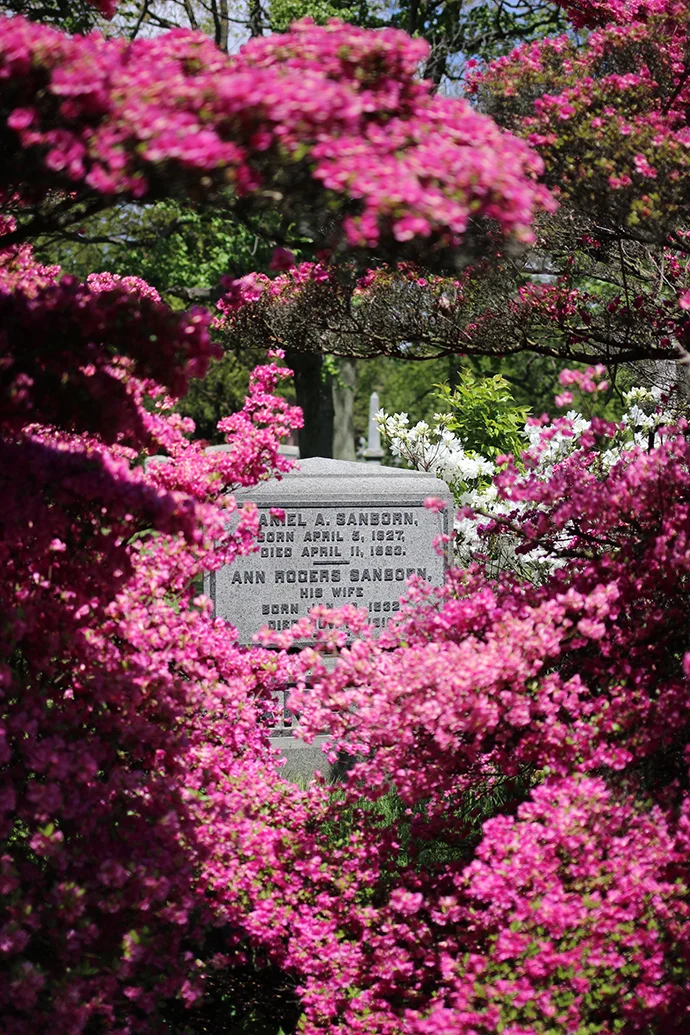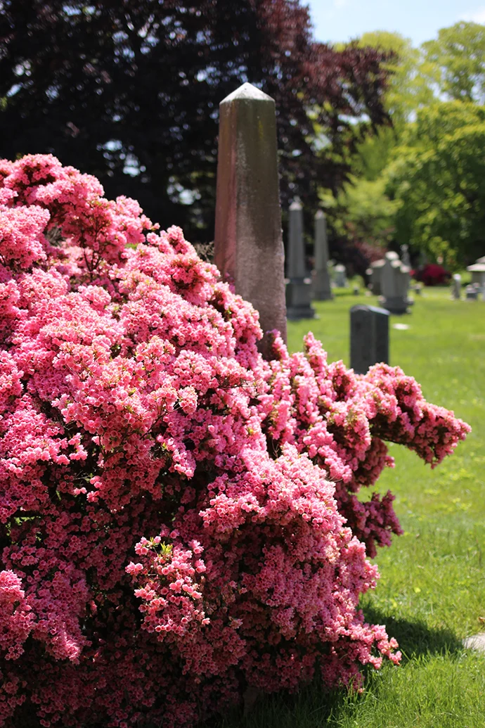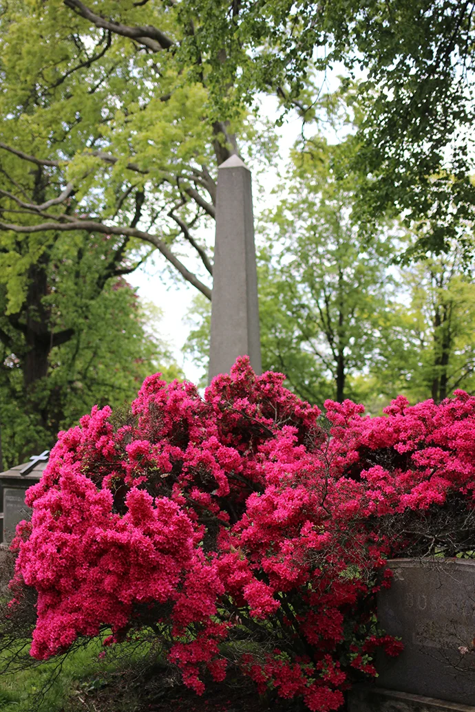 David lives two blocks from Green-Wood Cemetery, so we headed over there to check out the spring blooms. I became enamored with the bright, beautiful azaleas at Green-Wood last spring, and I was happy to be able to catch them again this year. A few of the bushes were already past their peak, but most were spectacularly full and the contrast of the bright flowers with the dark, heavy stones and statues was so fun to photograph.