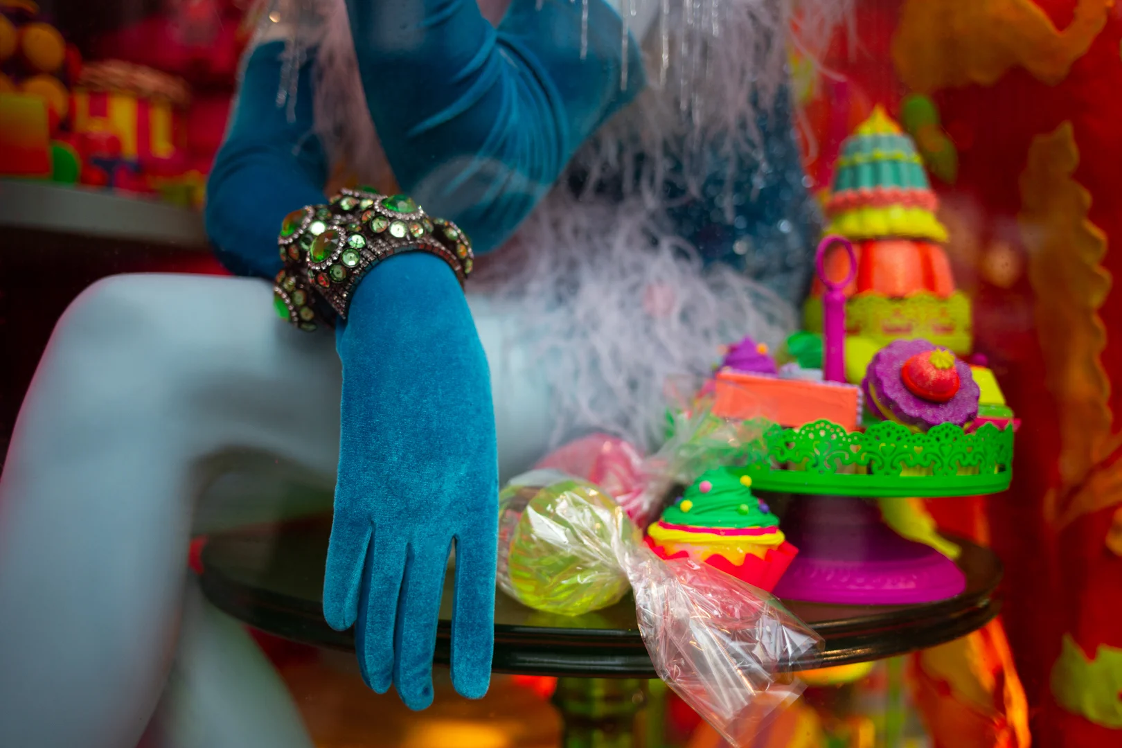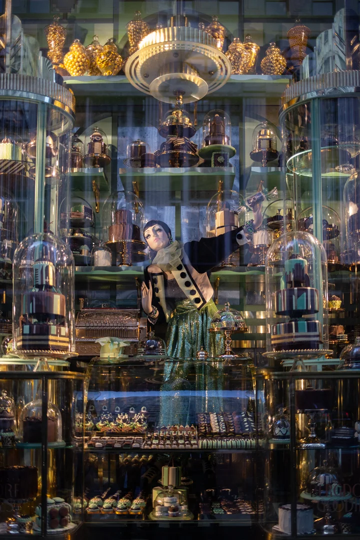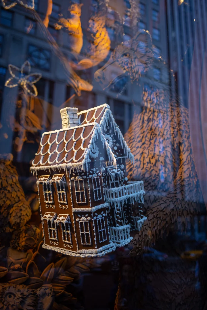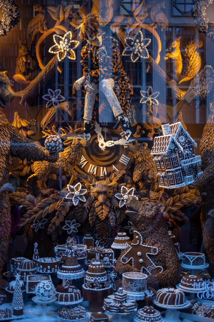 This year’s theme is “Bergdorf Goodies,” and I always appreciate a good name pun. Their Fifth Avenue windows all feature sweet holiday treats: neon cakes, chocolates, macarons, licorice, and gingerbread. Because Bergdorf is still a store trying to sell its designer fashions, each window features a mannequin wearing a coordinating fashion confection. As always, the craftsmanship and attention to detail is out of this world and I wish you could walk around inside of, and view the windows from all angles to take in every little piece.