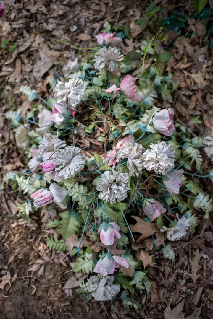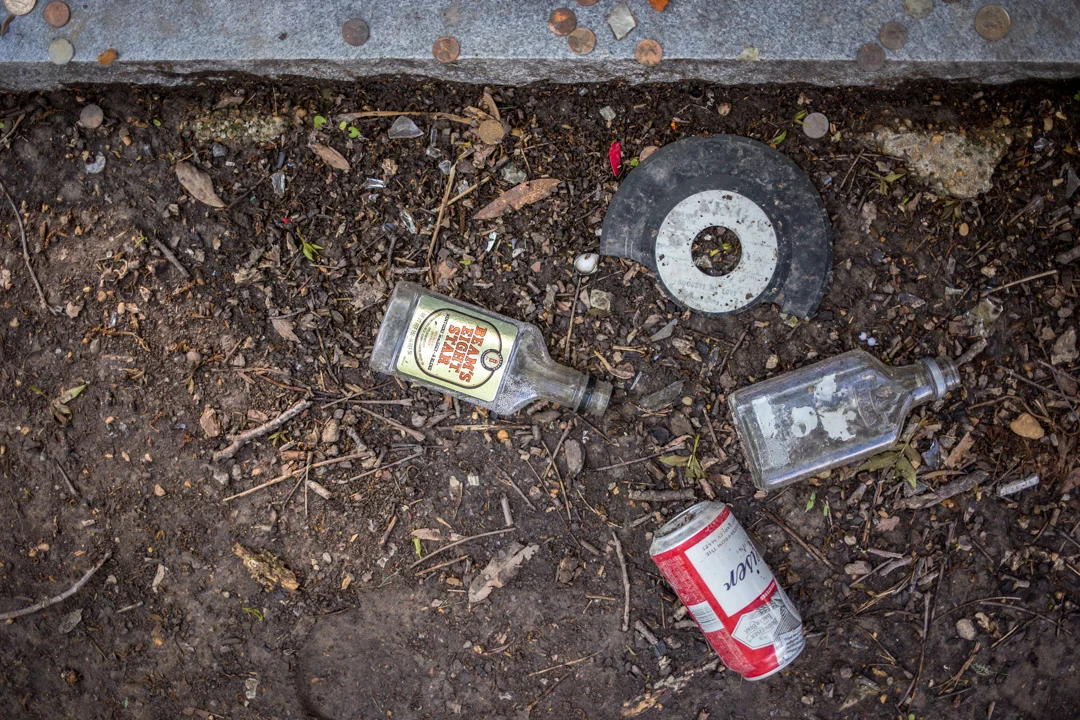 The church itself wasn't open when we visited, but it's exactly what I imagined a roadside baptist church in the middle of Mississippi would look like. The churchyard contains a handful of graves—including, coincidentally or not, several other Johnsons—and it was flooded and very muddy. If you're facing the church, Robert Johnson's grave is located in the back corner of the churchyard to the left, but it's hard to miss. His grave was covered in mementos—liquor bottles, beer cans, guitar picks, coins, a string of beads and other fan offerings like Divine's headstone in Maryland—and a donation box sits next to the headstone.
