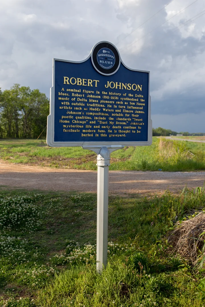 A Mississippi Blues Trail marker at the church reads: “ROBERT JOHNSON – A seminal figure in the history of the Delta blues, Robert Johnson (1911-1938) synthesized the music of Delta blues pioneers such as Son House with outside traditions. He in turn influenced such artists as Muddy Waters and Elmore James. Johnson’s compositions, notable for their poetic qualities, include the standards ‘Sweet Home Chicago’ and ‘Dust My Broom.’ Johnson’s mysterious life and early death continue to fascinate blues fans. He is thought to be buried in this graveyard.”