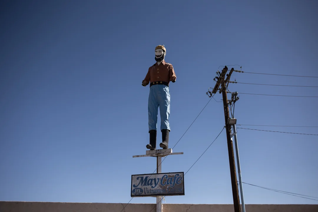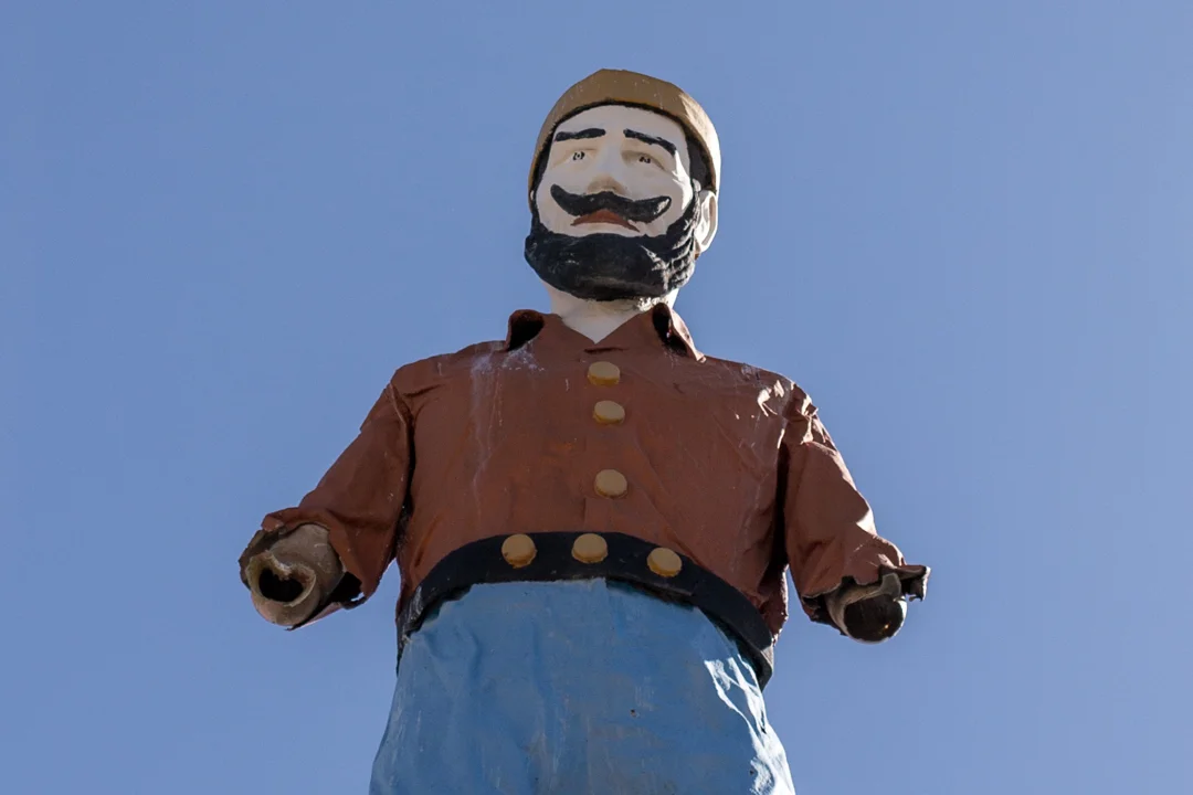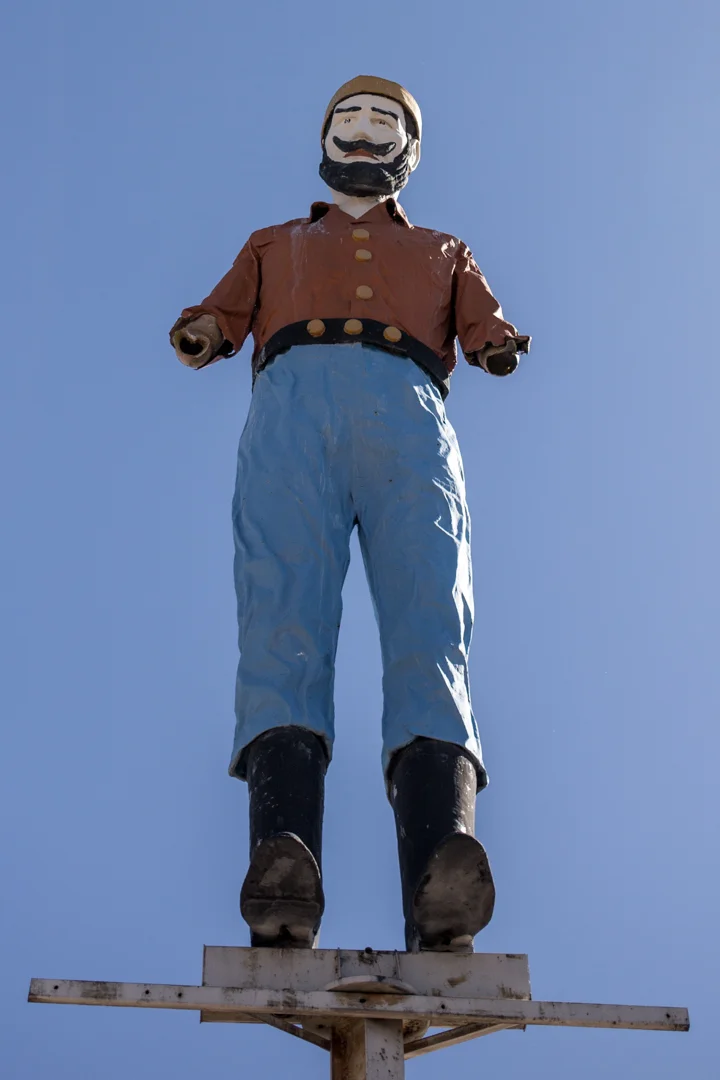 Referred to as the Bunyan Mutant or "Fidel," from far away you might mistake this guy for a real Muffler Man. This 2,000 pound fiberglass statue is perched on a customized steel beam 25 feet above the ground. His arms were damaged in a windstorm sometime after 2013, but he once held an axe just like a traditional Bunyan statue.