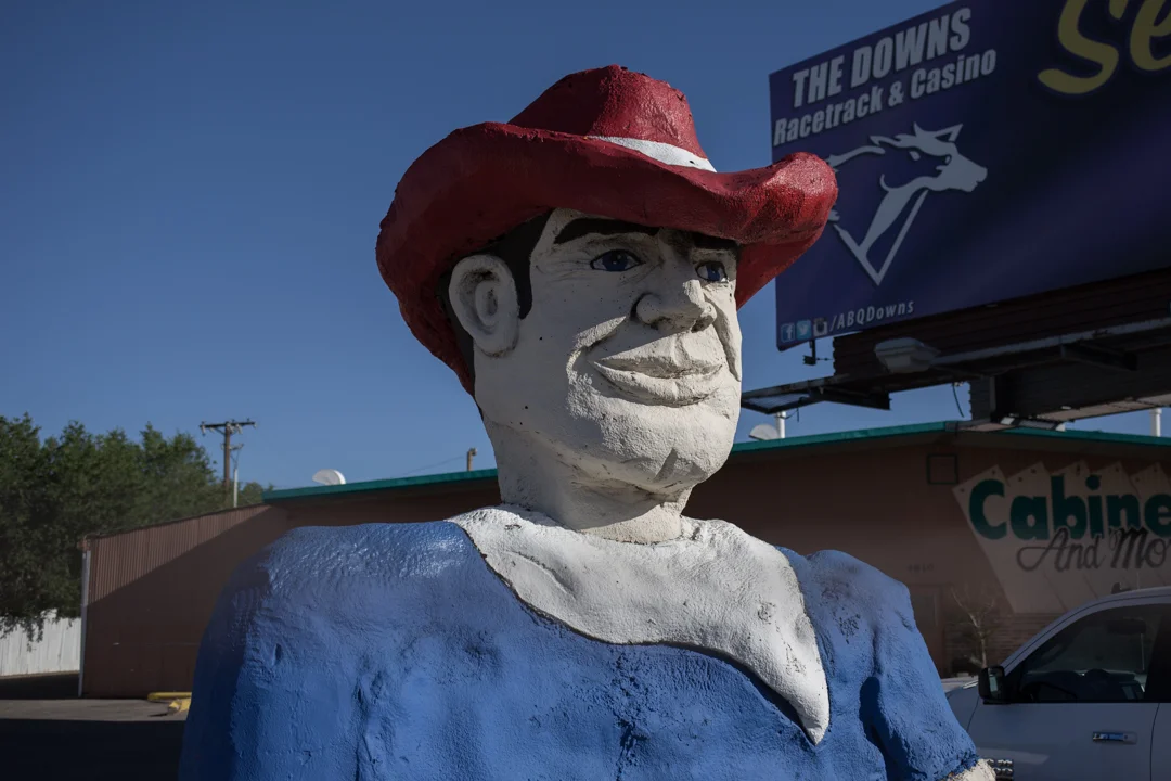 He originally stood outside of the Duke City Lumber Company store in the early 60's. The space is now home to a Vietnamese Cafe, and it's located on the corner of Louisiana Blvd and Central Avenue (old Route 66). He would be illegal to build today, but remains standing thanks to a grandfather clause in the Albuquerque sign ordinance.