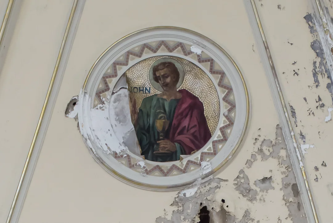 Because the church has had such a tumultuous ownership history, there isn't much left inside, but it's still a beautiful building to explore (and surprisingly light on graffiti). There are a few small stained glass windows that remain partially intact and large plaster angels stand guard from the edges of the domed ceiling. A beautifully hand-painted safe stands to the left of the altar in a side room, only remaining because it was obviously too heavy to think about moving.