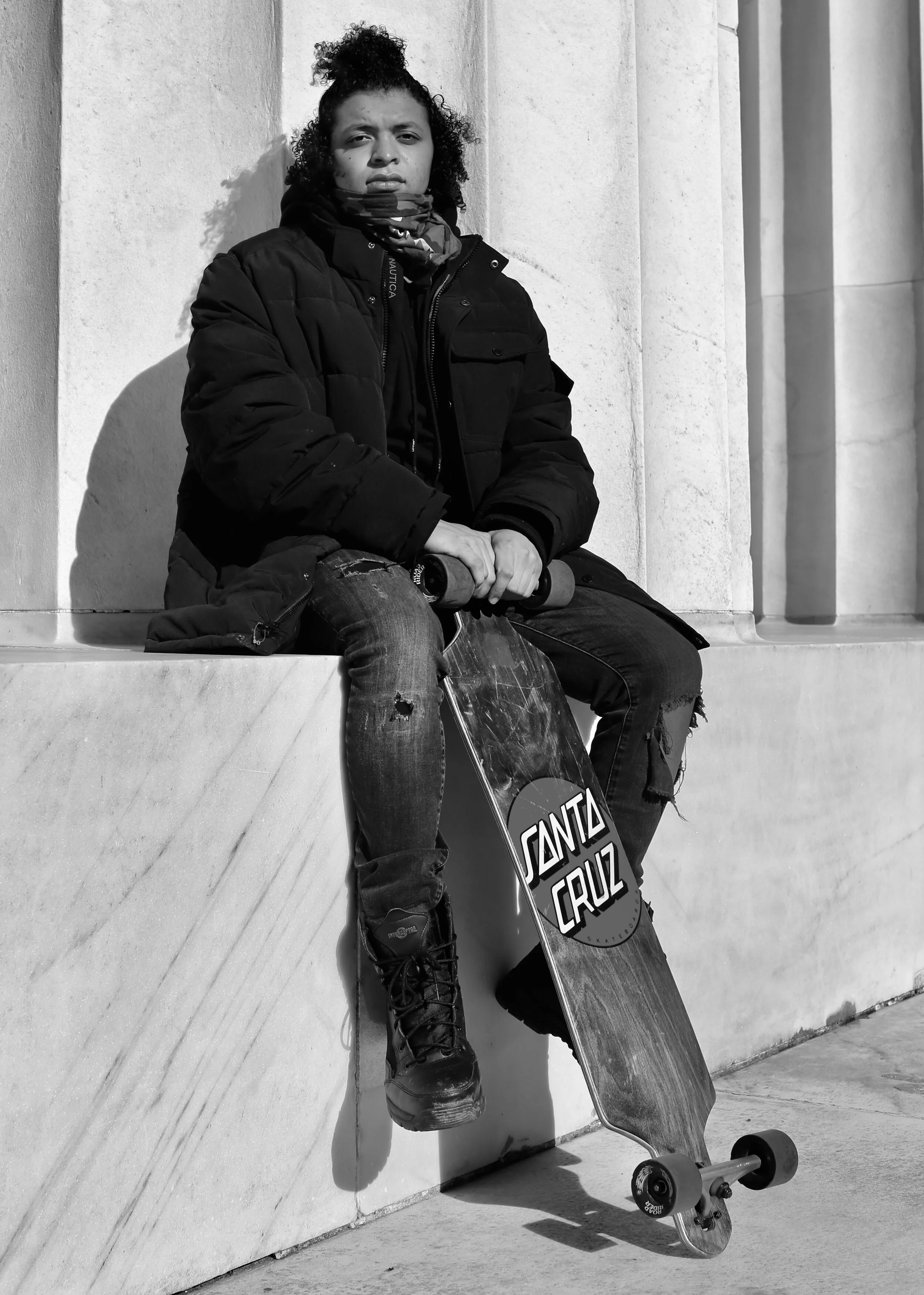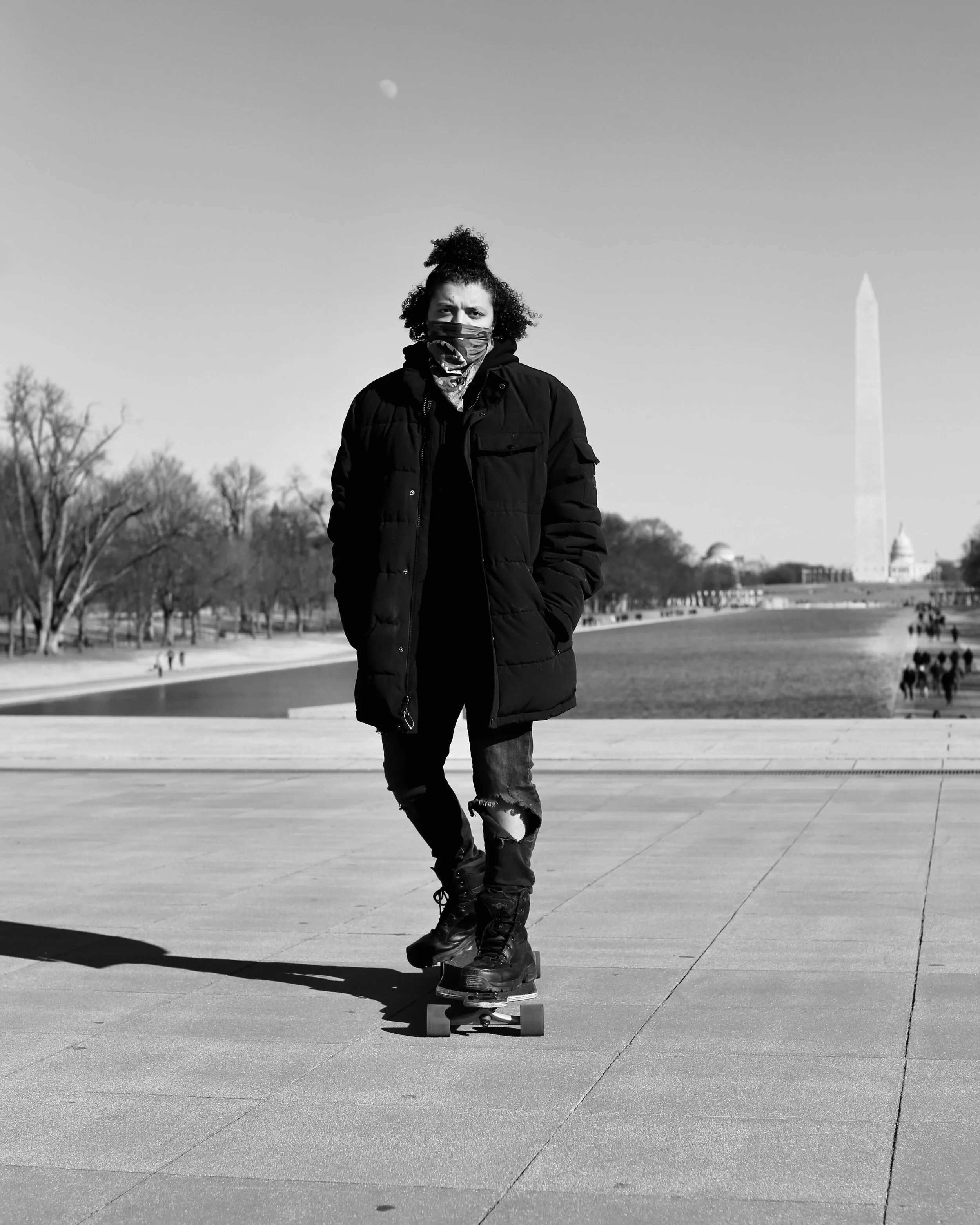 Like most people I encounter during the countless Black Lives Matter and other protests I attend during the pandemic, Dawes’s nose and mouth is almost always covered with a grey, red, and white bandana emblazoned with jagged teeth—reminiscent of the painted nose of a WWII fighter plane. For a few weeks in the summer he wore an eye patch. And the longboard? “I’ve just always loved longboarding,” Dawes says. “Plus it’s an efficient mode of transportation.”