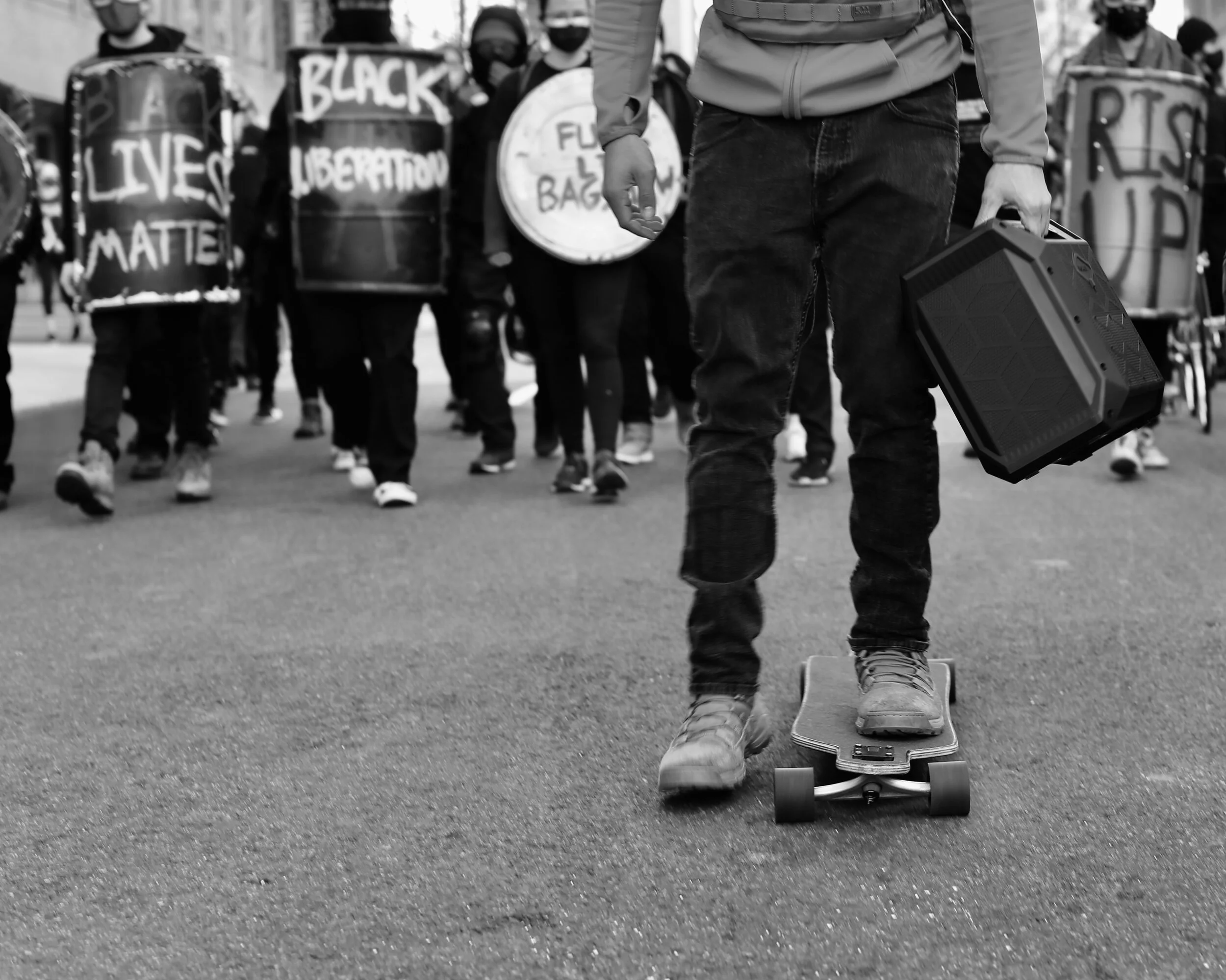 When someone asked the nascent group, “Who are you?” they made an Instagram page that same night—and a grassroots organization dedicated to “confronting the injustices that disproportionately affect Black and Brown communities” was born. The group grew quickly; they continue to march and organize mutual aid efforts with regularity—often co-led by Dawes threading through the crowd on his ever-present longboard.